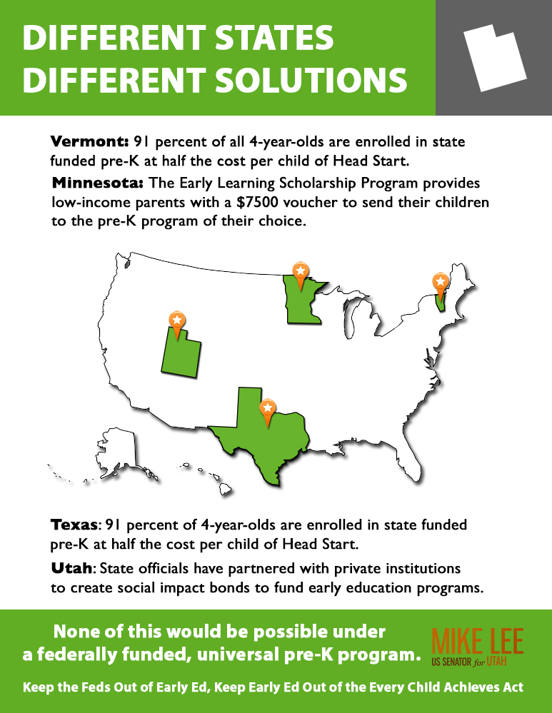 At the state and local level, even more innovative solutions are already working. In my home state of Utah, for instance, United Way of Salt Lake has partnered with two private financial institutions, Goldman Sachs and J. B. Pritzker, to provide first-rate early-education programs to thousands of Utah children. And they’ve done it without any interference from the federal government.