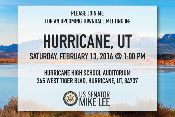 Please join Senator Mike Lee for a town hall meeting at the Hurricane High School Auditorium this Saturday, February 13, at 1:00pm.