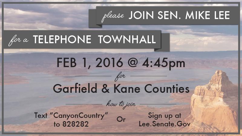 As part of Senator Lee’s plan to host interactive events with every county in Utah, Senator Lee is holding a live, interactive telephone event with the residents of Kane and Garfield counties. This event will be held on Tuesday, February 1 from 4:45 – 5:15 p.m. MT. Senator Lee looks forward to learning more about the specific issues affecting those who live in the rural counties of Utah. Residents of Kane and Garfield counties are encouraged to sign up for of this event by texting "CanyonCountry" to 828282, or by clicking the following link.